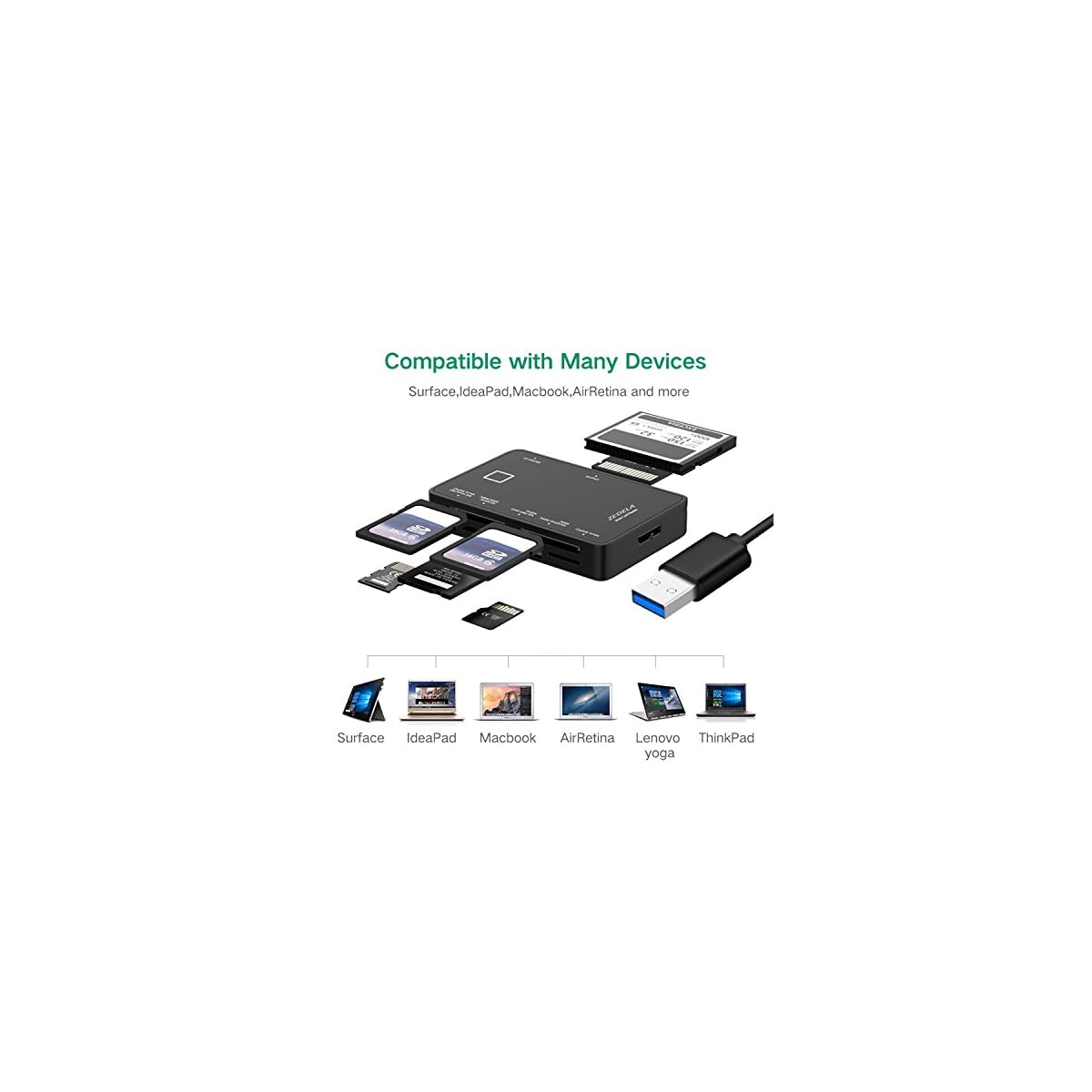 One Reader for Multi Cards: USB Card Reader is designed with 7 card slots , which allow you to read and transfer data the most popular flash media on the computer, laptop, tablet through USB 3.0 interface , including SDXC/SDHC/SD/Extreme I III SD/Ultra II SD/MMC/RS-MMC or Micro SD/TF/Micro SDXC/Micro SDHC/UHS-I or CF I/CF II or XD/XD1.21 or MS PRO DOU/MSHG or MS micro/M2 etc