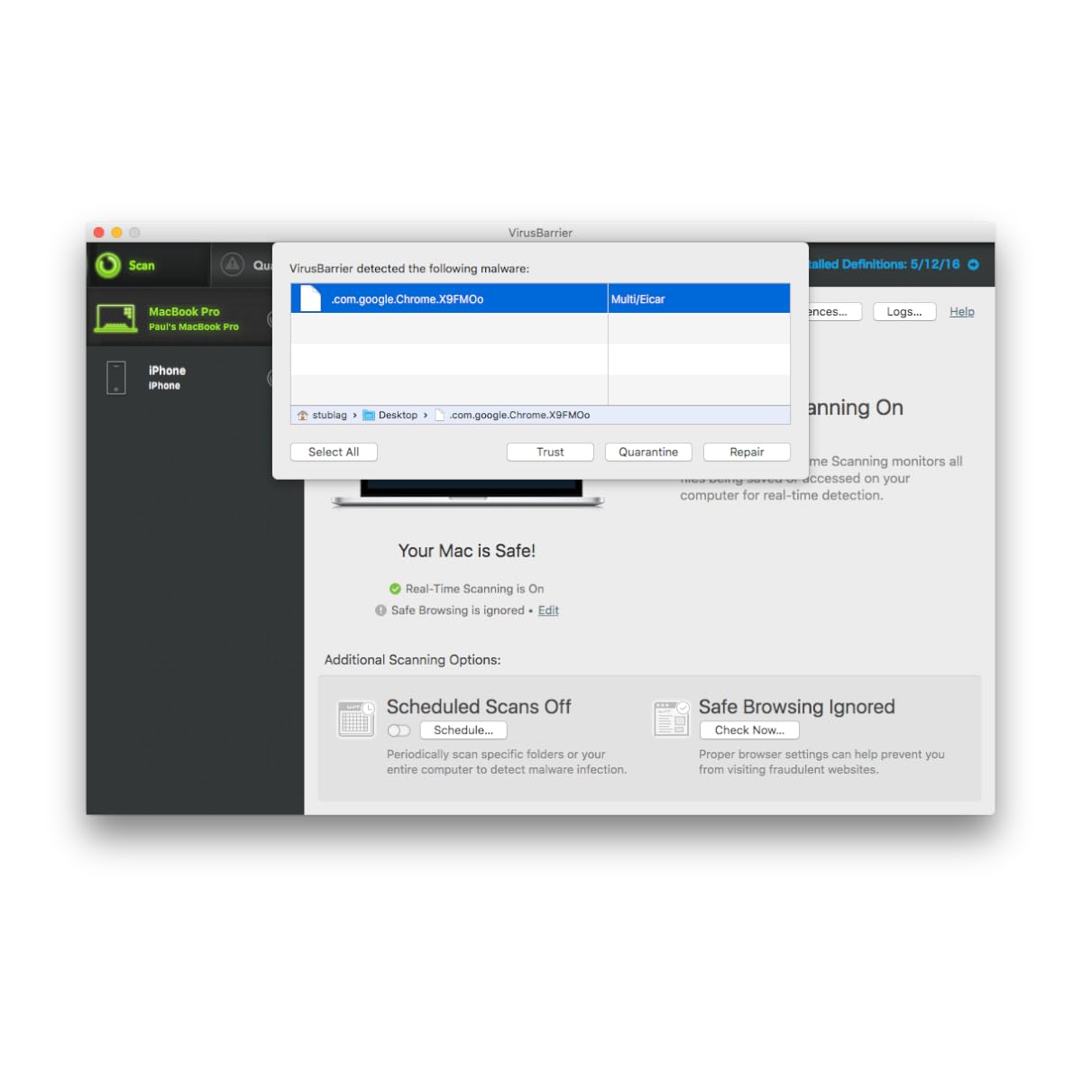 Scans for viruses on iOS devices and finds/eradicates viruses found in document directories on the devices
