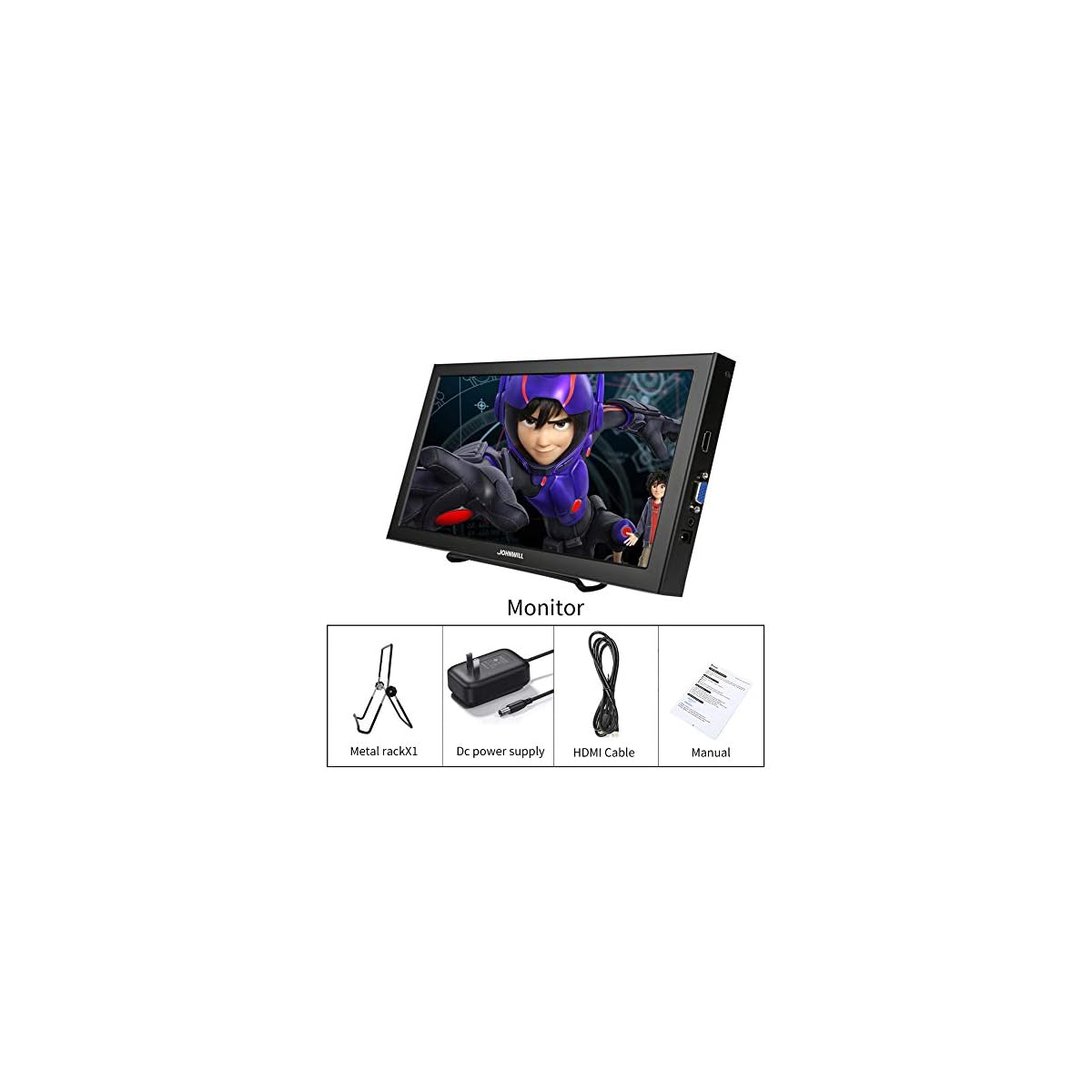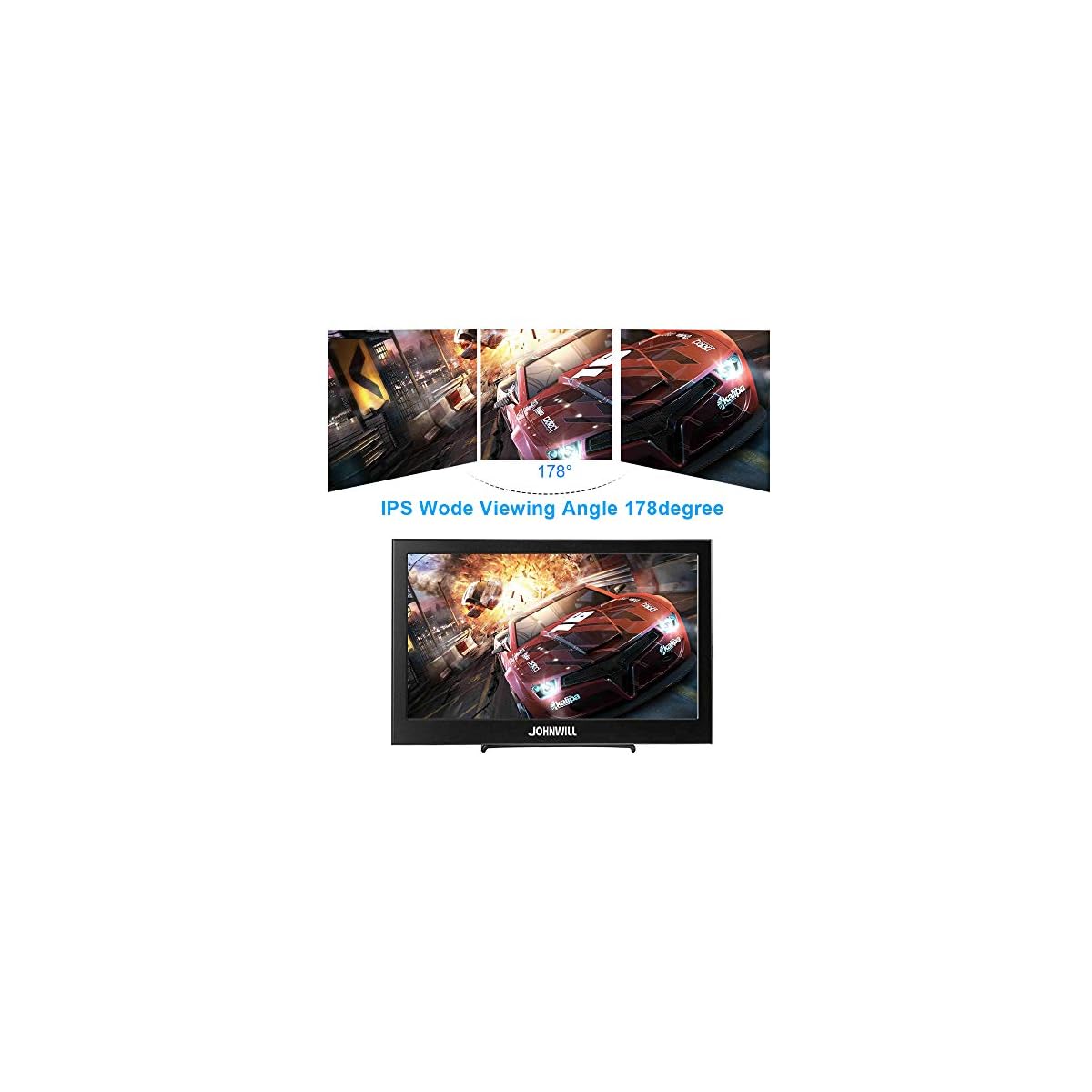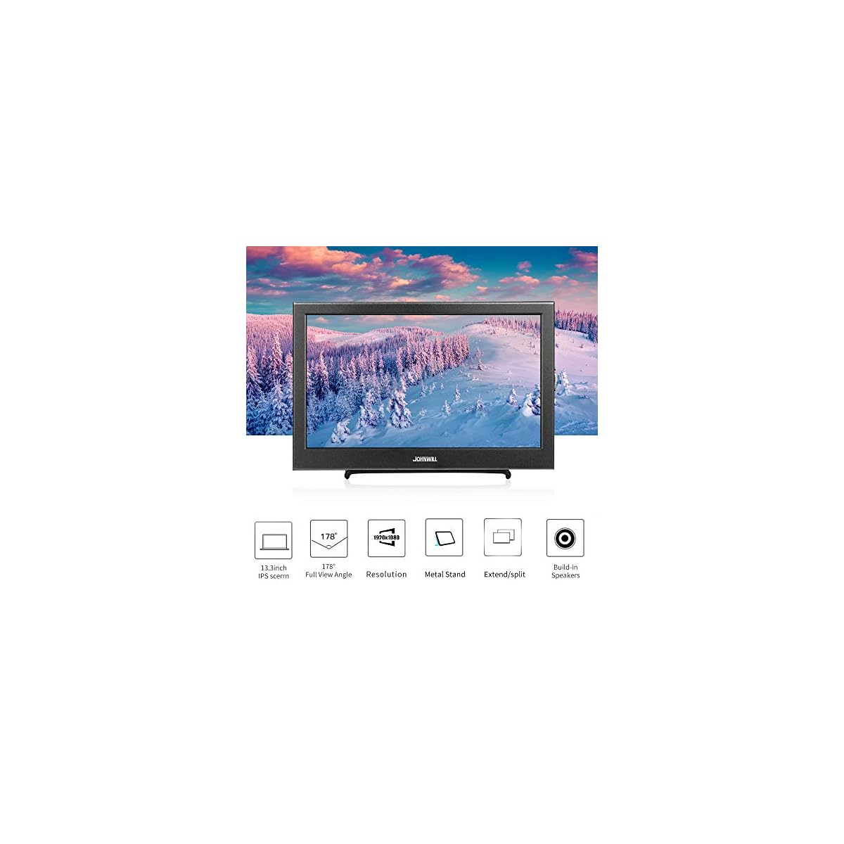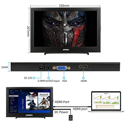 [Multi-interface:] JOHNWILL13.3 inch portable monitors: one HDMI input, it is portable HDMI monitor. A DC12V input interface: can be used to power the portable monitor. One input audio: audio signal input, transfer audio signals to the speakers. One VGA interface: for analog signals, pictures and sound. Built-in 1.5 W speaker.