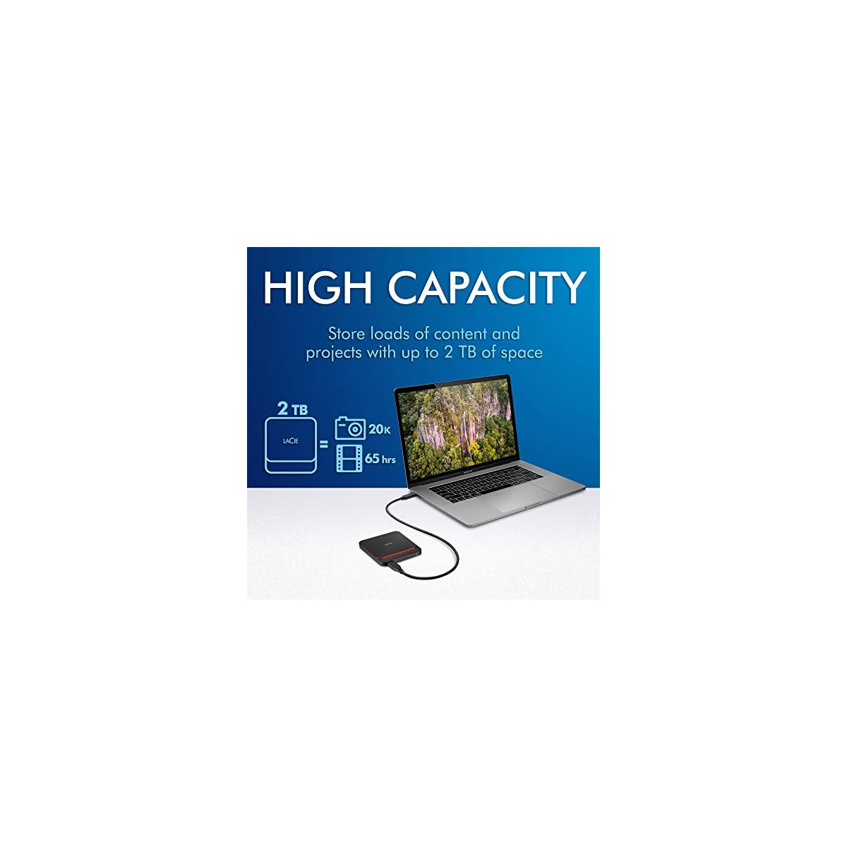 Armed with up to 2 TB of portable SSD capacity, you can store and edit a massive amount of digital content — up to 20K RAW photos,** up to 65 hours of video,** and the equivalent of over a dozen 128 GB SD cards.