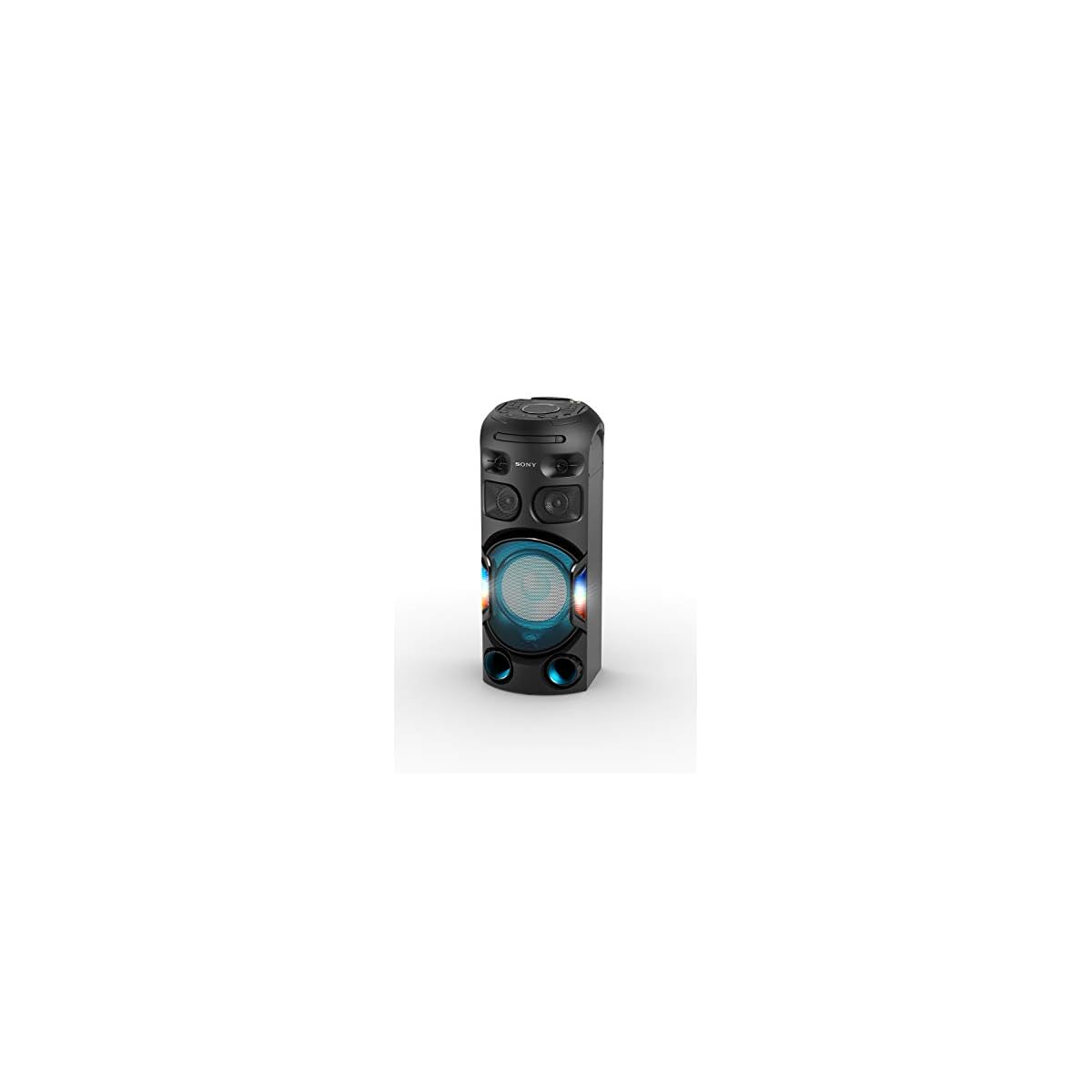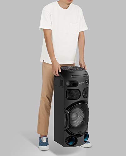 Get the party started with Sony’s MHC-V42D sound system. Whatever the occasion, the V42D will fill your space with big volume and booming bass. With angled tweeters spreading sound wider and the JET BASS BOOSTER ensuring bass reaches every corner, wherever you are in the crowd you will hear it clearly and feel it physically. You can also create an immersive festival vibe with the Live Sound Mode which floods your party space with the realistic sound of a live concert. With Near Field Communication (NFC) and Bluetooth, you can connect wirelessly to the high power audio system and get the music going right away. You’ll also benefit from Sony’s LDAC technology, which delivers superior-quality sound over Bluetooth. With different operation modes, you can control your party your way. Gesture Control lets you control the Sony MHC V42D’s functions quickly and easily with just a wave of your hand. The Sony | Music Centre app lets you select the tunes from the dancefloor. You can even connect up to three smartphones at once, so everyone can take turns as the DJ. Voice Control via the Fiestable app allows you to simply say the word and control your music and light display. Light up every corner of the party, even in large spaces with new wider angle multi-coloured party lights and speaker lights that synchronize to the beat, so you can enjoy an authentic nightclub or outdoor festival atmosphere at home. Plus you can get the crowd involved with the Fiestable smartphone app, which turns your smartphone display into your very own party light, mirroring the sound system’s colours and effects. Free your inner pop star with Sony MHCV42D’s karaoke mode. Use the two mic inputs to sing along with friends or even hook up a guitar or bass guitar and rock out. Boost the party and enjoy more powerful sound by connecting multiple speakers via Bluetooth. You can sync up to 50 compatible home audio systems. Not in the mood for dancing? Then throw a movie party. With the HDMI (ARC) output, you can easily hook the sound system up to your TV and enjoy big sound from your top films. The Sony MHC-V42D has even a built-in DVD player, so you can turn your living room into a cinema for you and your friends. Designed for portability, the party sound system lets you take the party on tour. Simply tilt it back on the casters and roll it away to your next stop.