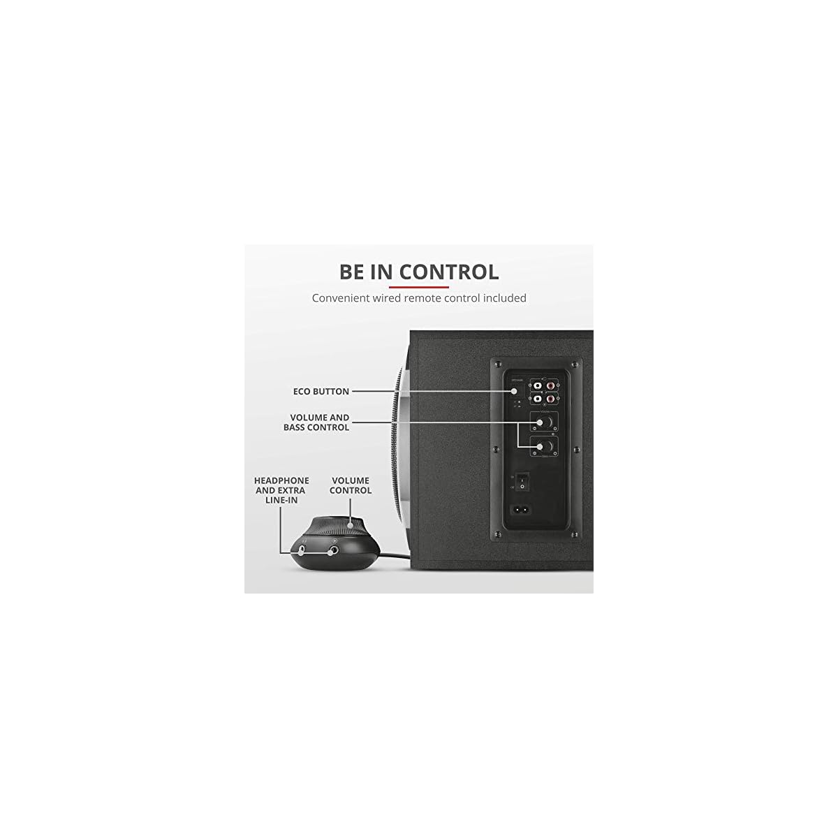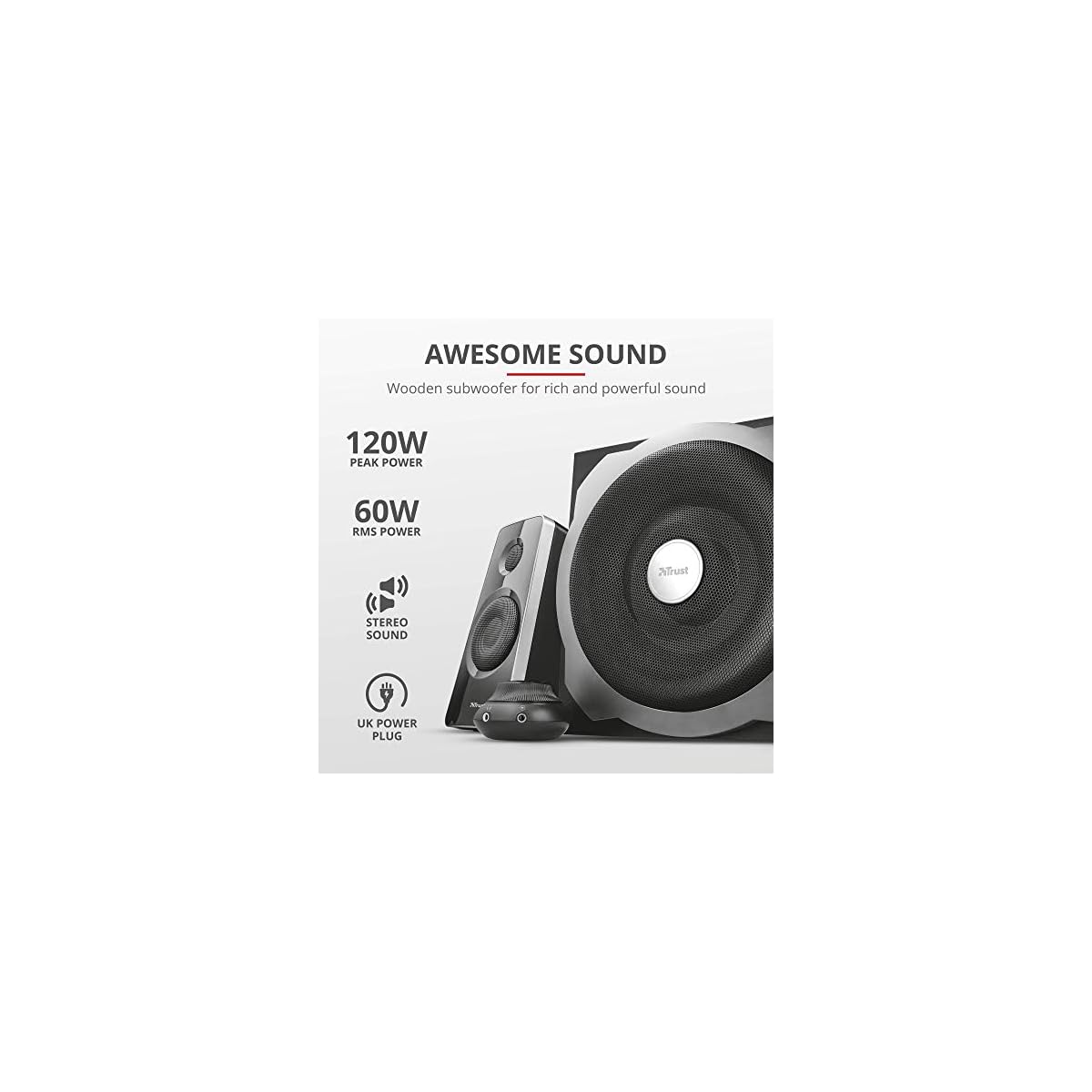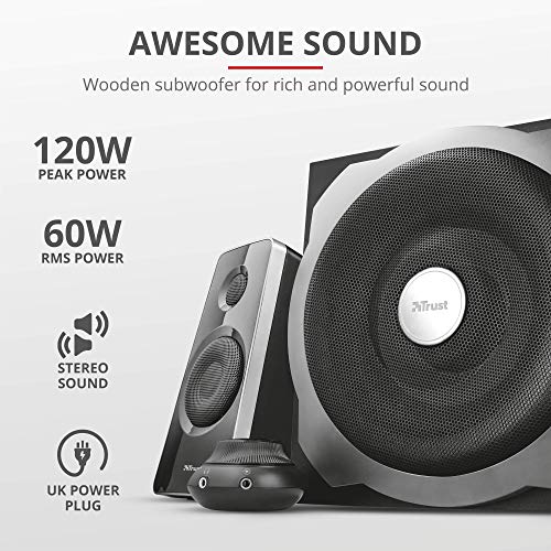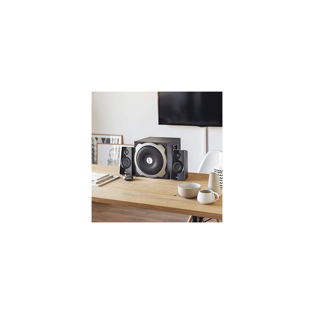 2.1 speaker set including wooden subwoofer with a total RMS power output of 60 W (120 W peak power).