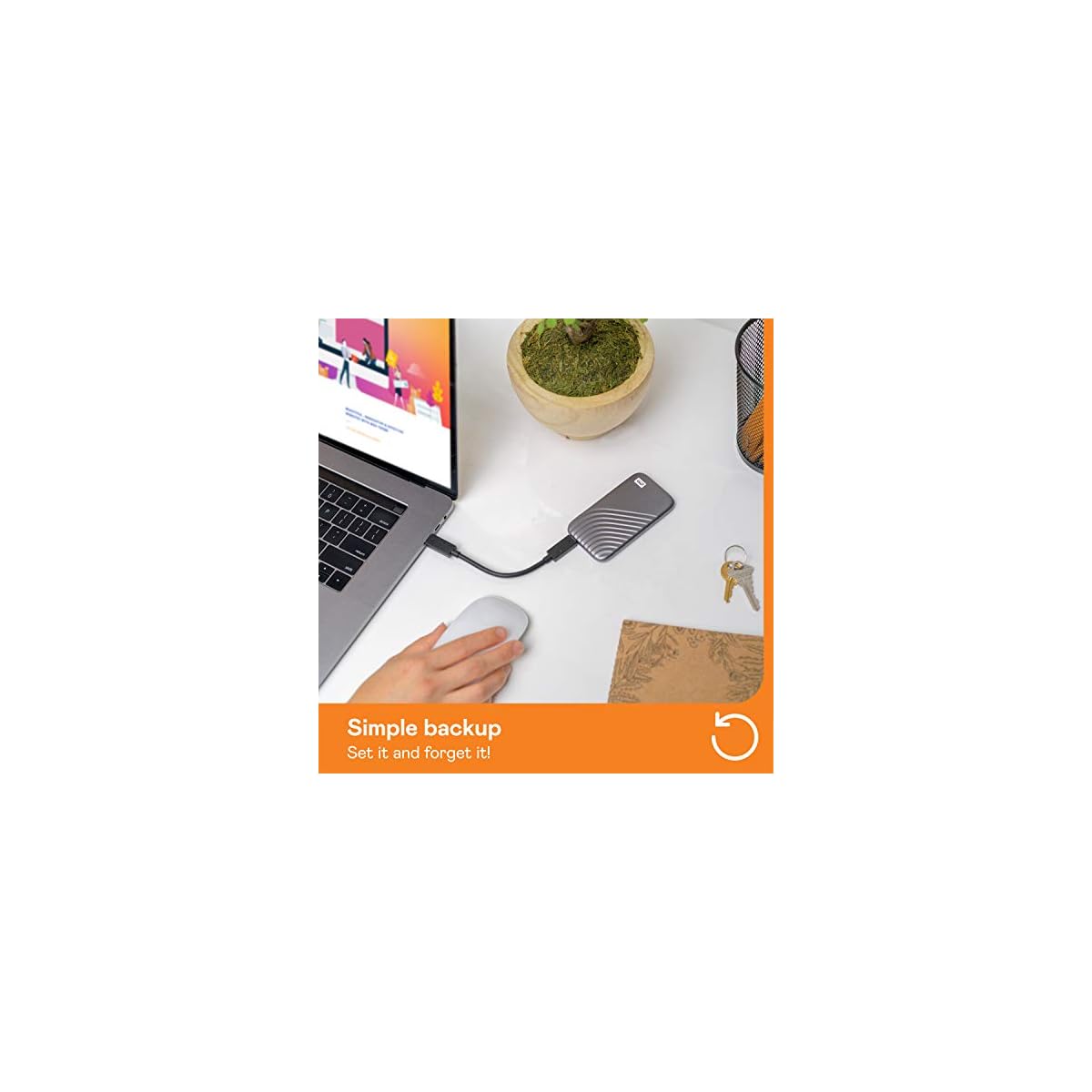 Save, access and protect the content that matters to you with the My Passport SSD, giving you accelerated read speeds up to 1050MB/s and write speeds of up to 1000MB/s with NVMe technology. Help secure your drive and keep productivity flowing with password enabled 256-bit AES hardware encryption. Resist drops of up to 2 metres with a sleek, durable metal design that is both shock and vibration-resistant. Find peace of mind with the fastest My Passport drive to date, able to simply backup your data and is compatible with Mac and PC, ready to use right out of the box.