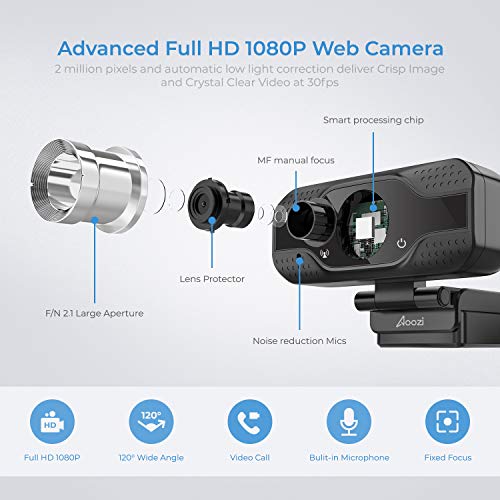Built-in Two Noise Reduction Microphone: Aoozi smart 1080P internet camera is supplied with an omnidirectional microphone that fiter background noise, pick out up your voice at 10ft distance, very best for online teaching, blogging, conferencing, Live streaming, video calling, social gaming.